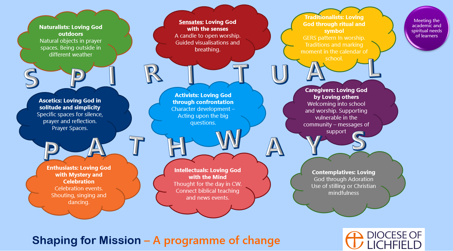 Our spiritual spaces in schools enable children and young people, of all faiths and none, to explore these life questions, spirituality and faith in a safe, creative and interactive way. Taking a broadly Christian perspective as a starting point, spiritual spaces give our children an opportunity to develop skills of personal reflection and to explore prayer in an open, inclusive and safe environment. The approach does not proselytise and purposely allows pupils to make their own meaning and to draw their own conclusions.